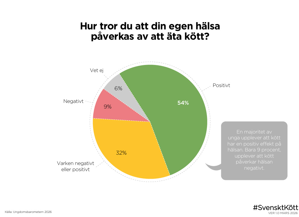 En ny undersökning från Ungdomsbarometern 2026 visar att kött har fått en starkare position i ungas vardag. Hela 54 procent av de tillfrågade uppger att kött har en positiv effekt på deras hälsa, medan endast 9 procent ser det som negativt.