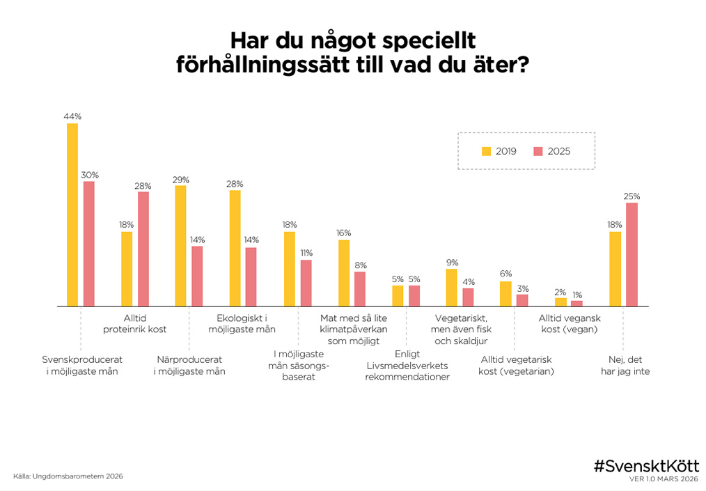 Undersökningen bygger på svar från unga mellan 15 och 24 år och analyserar deras matvanor, kostpreferenser och syn på hälsa. Studien är genomförd av Ungdomsbarometern på uppdrag av Svenskt Kött och sätter resultaten i relation till långsiktiga konsumenttrender.