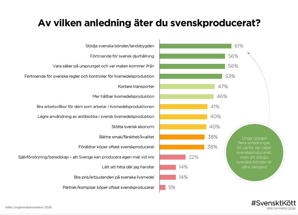 Samtidigt spelar ursprung en fortsatt viktig roll. Många unga förknippar svenskt kött med kvalitet, kontroll och trygg produktion. I en tid där frågor om livsmedelsförsörjning och nationell beredskap blivit mer aktuella, väger detta tungt.