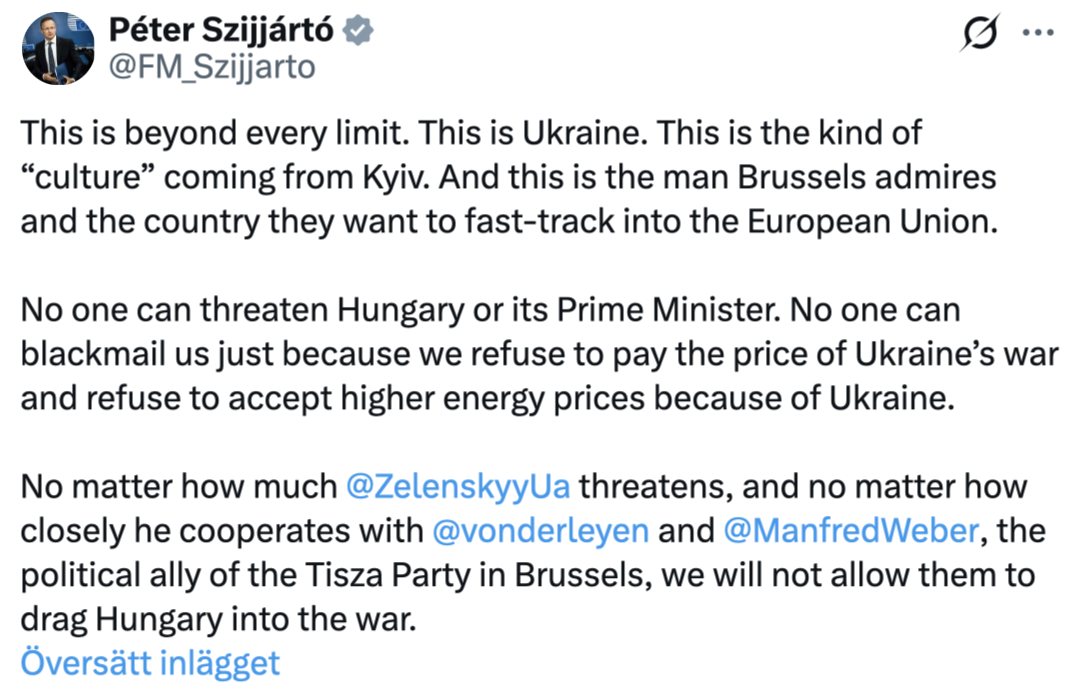 “Det här är helt över gränsen. Det här är Ukraina. Det är den typ av ’kultur’ som kommer från Kiev. Och detta är mannen som Bryssel beundrar och det land som de vill skynda på in i EU. Ingen kan hota Ungern eller vår premiärminister.”